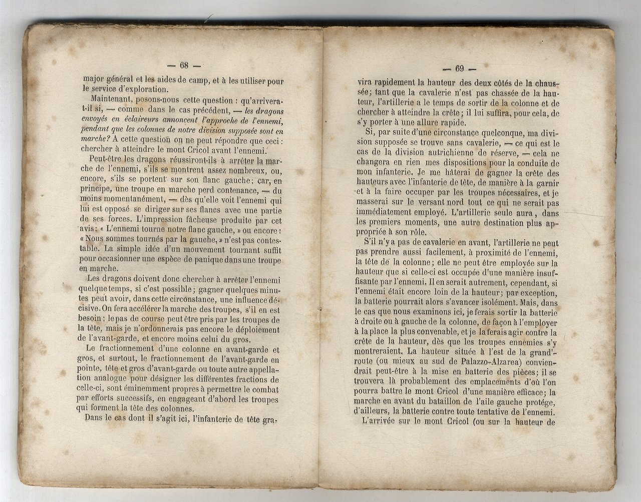 Paris, Librairie Militaire de J. Dumaine, 1877, in-16, br. editoriale con copertina anteriore e dorso fittizi, pp.187, (1). Con una carta piegata in fine. Fioriture. Ire Livraison: Détails tactiques tirés de la bataille de Custoza livreée le 24 juin 1866. Ex libris G. Ferrari.