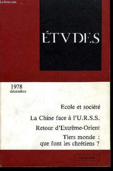 Etudes tome 349 n� 12 - Retour d'Extr�me Orient par J. Sommet, Quand la Chine fait face a l'U.R.S.S. par L. Trivi�re, Chr�tiens et tiers monde : quelle pratique ? par S. Urfer, L'�cole et la soci�t� par P. Vallin