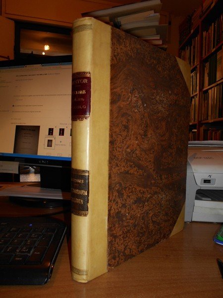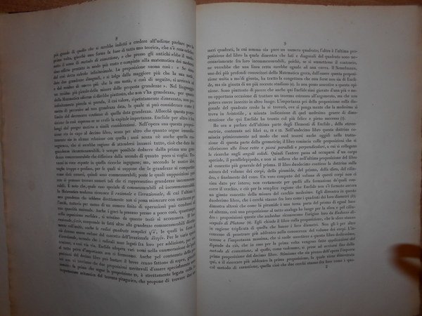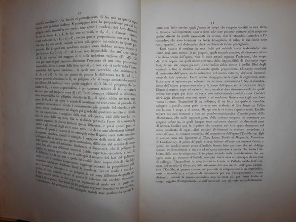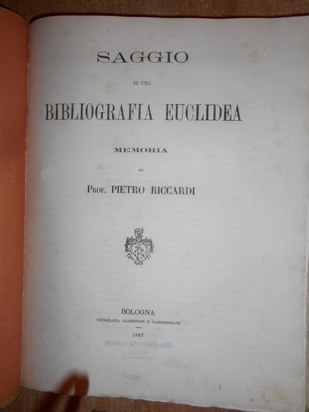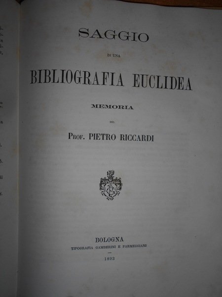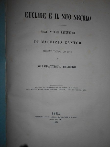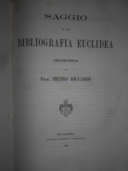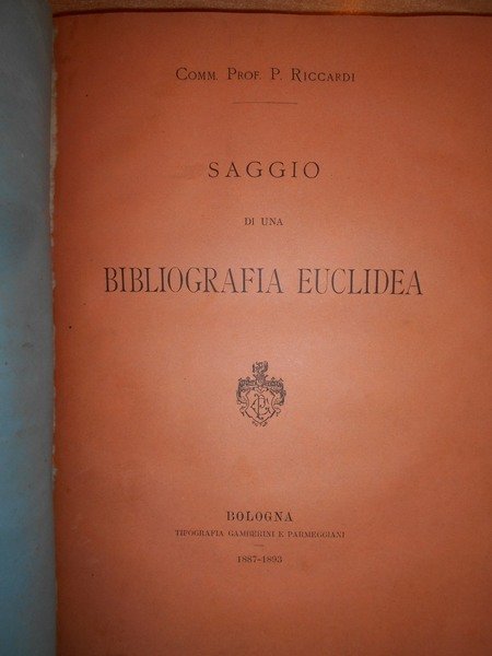 EUCLIDE e il suo secolo. Saggio storico matematico. Di Maurizio Cantor. Versione italiana con note di Giambattista Biadego. Roma, Tipografia delle Scienze Matematiche e Fisiche, 1872. In-4°, m. pergamena con larghe punte, titoli in oro entro due tasselli al dorso. 75 pp. Comm. Prof. P. Riccardi. Saggio di una Bibliografia Euclidea. Bologna, Tipografia Gamberini e Parmeggiani, 1887 - 1893. 4 parti in un vol. in-4, pp. 125; 25; 60; 58, bross. edit. Raro esemplare completo con le brossure originali conservate. Neg. lett. mod. mob. M.