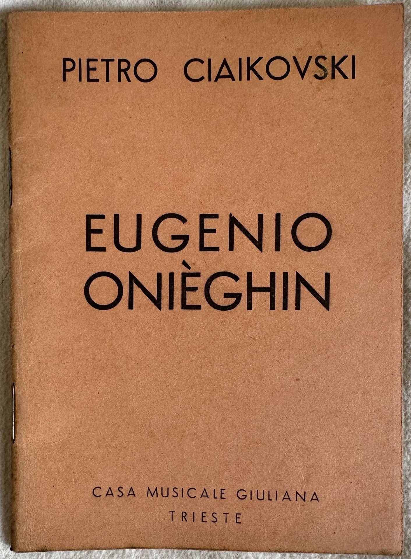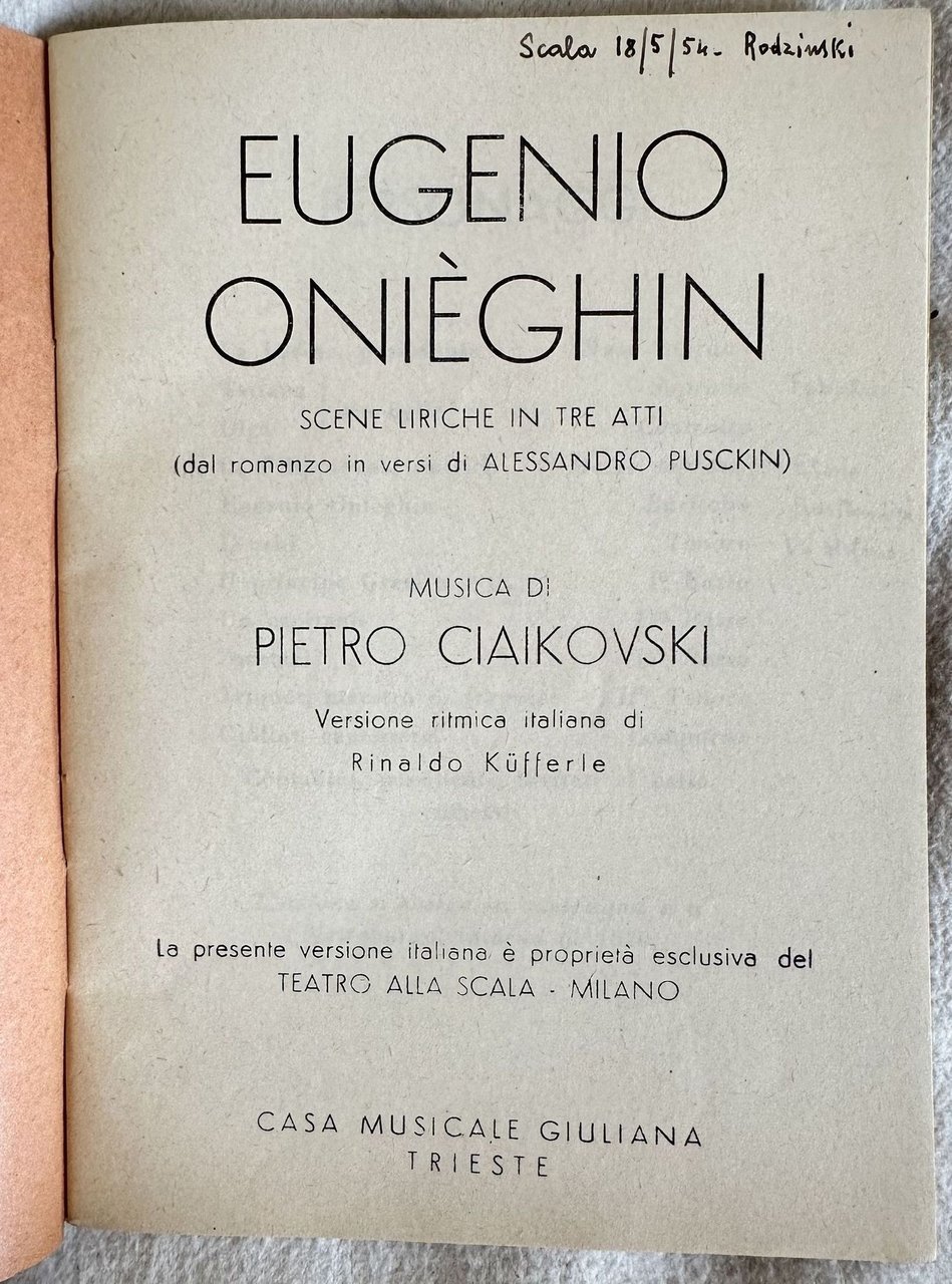 Edizione del 1954 del libretto d'opera "Eugenio Onieghin" musica di Pyor Ilyich Tchaikovsky sulla versione di Rinaldo Kufferle. La prima rappresentazione ebbe luogo al Teatro Malyi di Mosca il 29 marzo 1879 . Nota manoscritta al frontespizio: "Scala Rodzimski 18/5/54". Indicazione manoscritta degli attori di quella rappresentazione. In ottime condizioni. Copertina editoriale in ottime condizioni con lievi usure ai margini e dorso. Legatura in buone condizioni. All'interno le pagine si presentano in ottime condizioni con rare fioriture. In 16. cm 17x12. Pp. 55+(1).Edition of 1954 of the booklet of the work "Eugenio Onieghin" music by Pyor Ilyich Tchaikovsky on the version by Rinaldo Kufferle. The first representation took place in the Theatre Teatro Malyi in Mosca the 29th of march 1879 Handwritten note in the titlepage: "Scala Rodzimski 18/5/54".Handwritten indication of actors of that representation In very good conditions. Editorial cover in very good conditions lightly worn in the extremities. Binding in good conditions. Pages are in very good conditions with occasional foxing. In 16. cm 17x12. Pp. 55+(1).