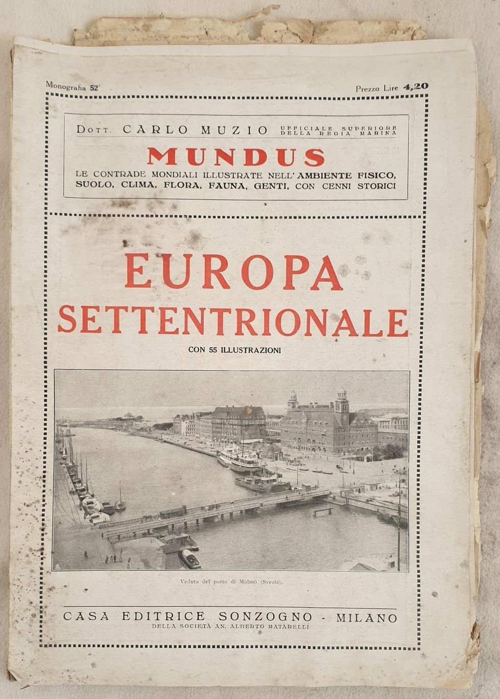 Edizione senza data ma degli anni '20 di questo fascicolo sull'Europa settentrionale della collana Mundus. I paesi descritti: Lapponia, Norvegia, Svezia, Numerose foto all'interno tra cui Tornetrask, Cascata del Gran Lago, Abisko, Isola degli orsi, ghiacciaio di Baia Rossa, Magdalena Bay, Spitzbergen, Kollafiord, Reykjavik, Tromso, Trondhjen, Hammerfest, OddeTrondhjen, Naerofiord, Christiansund, Lyngenfiord a Tromso, Bergen, Stoccolma, Upsala, Malmo, Karlskrona, Visby, Goteborg, Norrkoping, Sundsvall, Tokeboda, SjotorpTannforsen, Dalecarlia ecc. In mediocri condizioni. Copertina editoriale in mediocri condizioni con usure, parti mancanti e macchie ai margini e dorso. Legatura quasi assente. All'interno le pagine si presentano in discrete condizioni con fioriture, macchie, gore e usure marginali. Piegature agli angoli. In 4. Dim. 29,5x22 cm. Pp. 43.