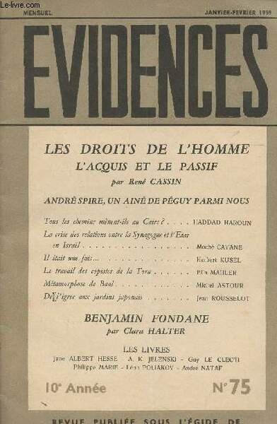 Evidences - 10e année n°75 Janv. fév. 1959 - Dixième anniversaire de la Déclartion des Droits de l'homme, l'acquis et le passif par René Cassin - Tous les chemins mènent-ils au Caire ? par Haddad Haroun - La crise des relations entre la Synagogue et