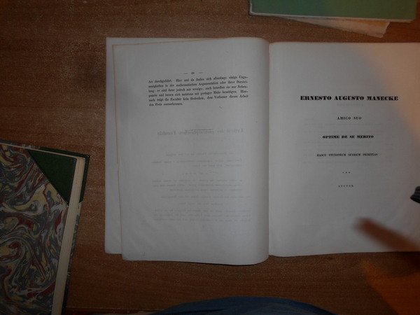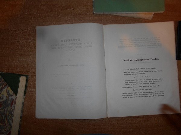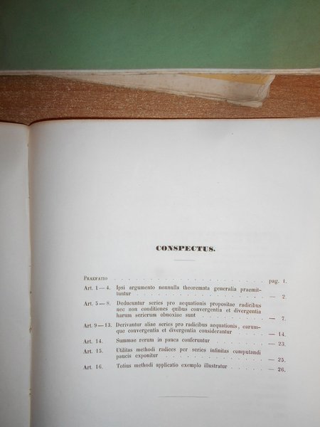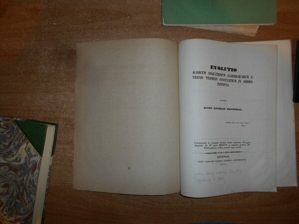 Auctore JUSTO GEORGIO WESTPHAL (1824-1859). Gottingae, Typis Expressit Officina Academia Dieterichiana, 1850. EVOLUTIO Radicum Aequationum Algebraicarum e Ternis Terminis Constantium in series infinitas. In-4°, br. muta. iv, 27 pp. con numerosi esempi di algebra. Opuscolo ben conservato. Poggendorff, II, 1306. Uff. stanzetta antic. mob. destra opuscoli.