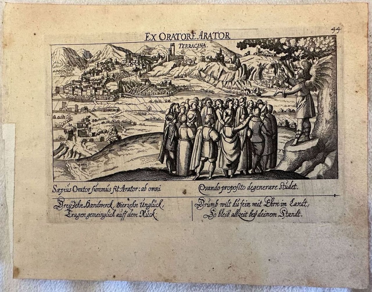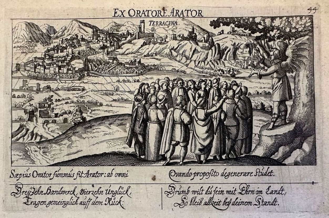 Finissima veduta di Terracina tratta dalla celebre opera di Daniel Meisner "Thesauri philo-politici" stampata a Francoforte nel 1626. In primo piano un angelo intrattiene una folla di curiosi e sullo sfondo la città di Terracina. Autore: Daniel Meisner (1585-1625) Data: 1626 Tecnica: Acquaforte Dimensione del foglio: 182x140 mm Dimensione incisione: 150x95 mm Condizioni: Buone. Rare fioriture.Very fine view of Terracina taken form the famous work of Daniel Meisner "Thesauri philo-politici" published in Francoforte in 1626. An angel talking to a crowd and in the back the city of Nocera Umbra. Author: Daniel Meisner (1585-1625) Date: 1626 Technique: etching Leaf Dimension: 182x140 mm Engraving Dimension: 150x95 mm Conditions: Good conditions. Occasional foxing.