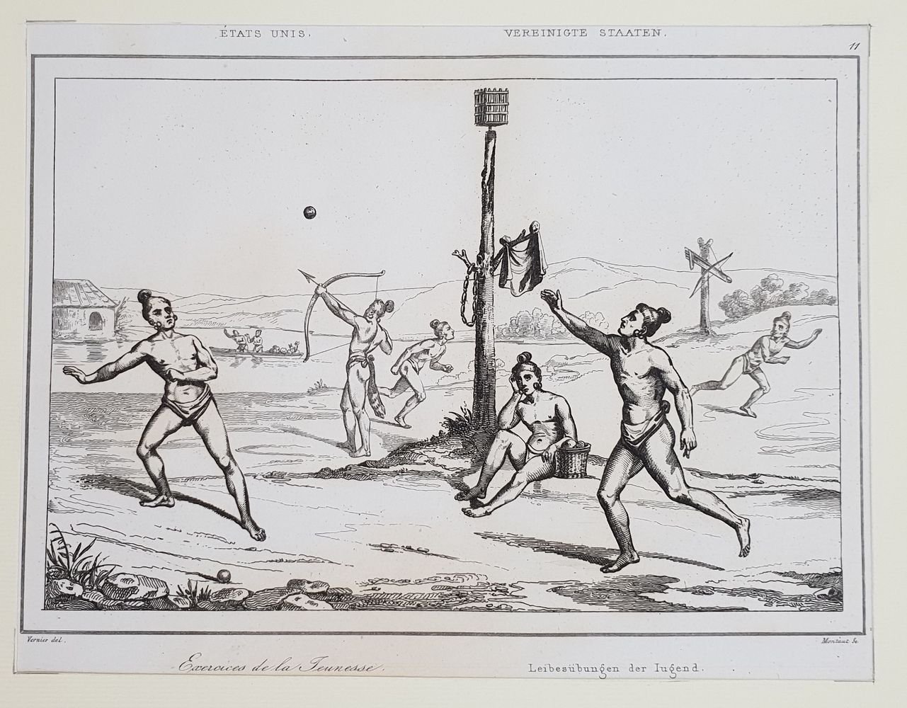 Veduta animata del 1838 circa che mostra indiani nativi mentre giocano montata in passepartout. Data: 1838 circa Tecnica: acquaforte Dimensione foglio: 17,5x25 cm Dimensione incisione: 12x15,5 cm Condizioni: Buone. Rare fioriture.Nice view of exercises of youth of 1838 circa mounted in a passepartout. Author: Montaut after Vernier Date: 1838 circa Technique: Steel etching Passepartout Dimension: 17,5x25 cm (6.9x9.8 inches) Engraving Dimension: 12x15,5 cm (4.7x6.1 inches) Conditions: Good conditions. Some foxings and water stains.