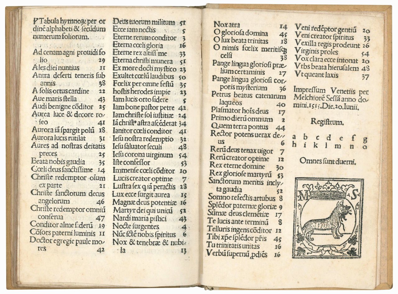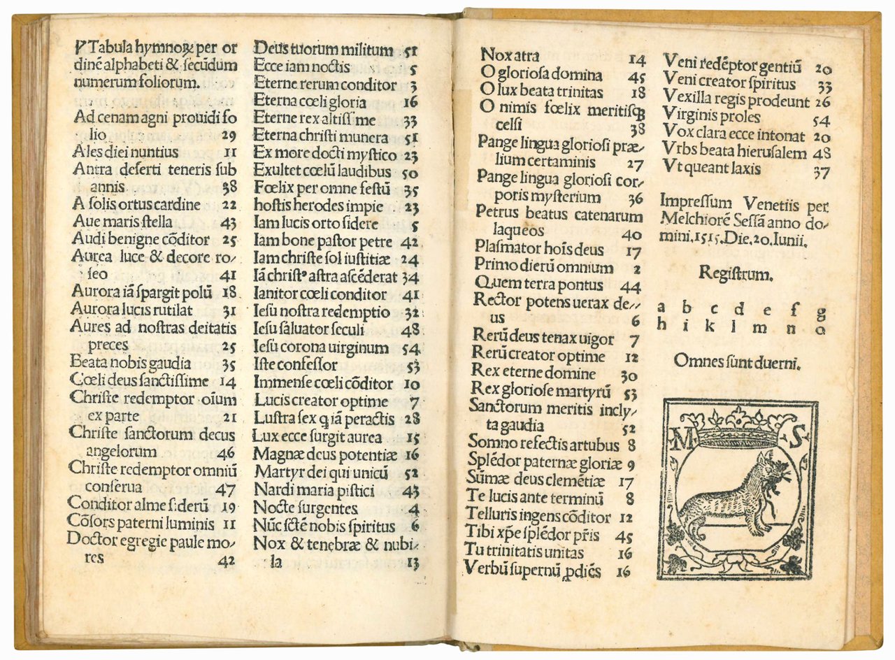 Expositio pulcherrima hymnorum per annum s[ecundu]m Curiam non amplius impressa. Colophon: Impressum Venetiis per Melchiore[m] Sessa[m] anno domini 1515. Die 20. Iunii