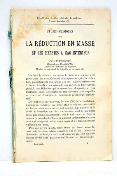 Extrait des Archives générales de médecine. Numéro d'octobre 1876. Etudes cliniques sur la réduction en masse et les hernies à sac intérieur.