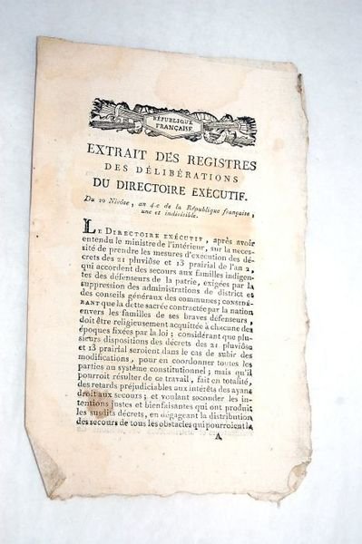 EXTRAIT des registres des délibérations du directoire exécutif, du 20 nivôse, an 4 de la République française, une et indivisible.