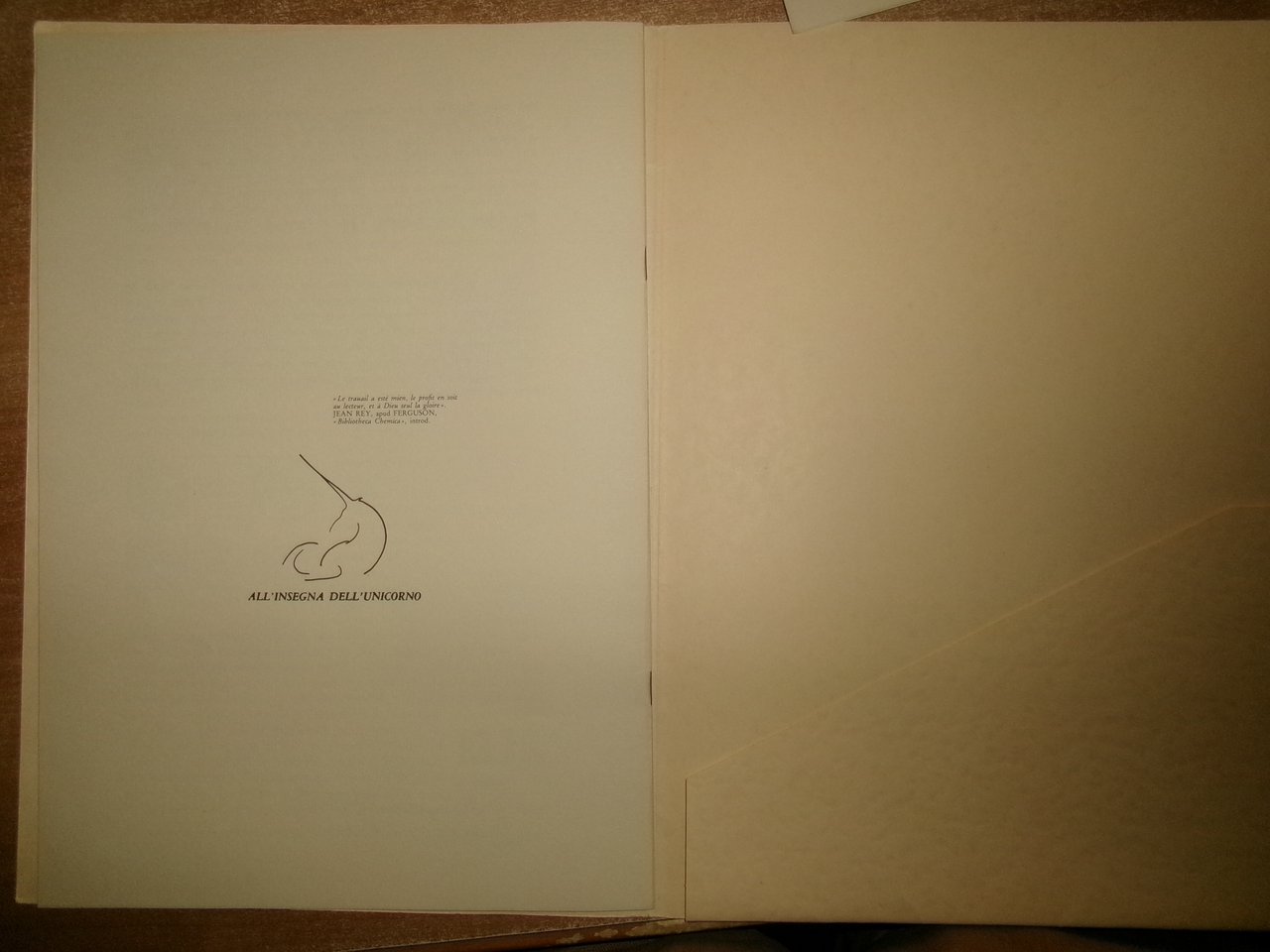 F. De Mély. LA VIRGA AUREA du Fr. J.-B. d' Ecosse. Milano, Archè, 1984. Una cartella in-4° grande contenente un opuscolo con testo in francese con due punti metallici di 11 pp. con numerose illustrazioni in nero n.t. Nell' apposita tasca vi sono 5 tavole in nero ripiegate. Come nuovo in tiratura limitata di 500 esemplari numerati (Es. n. 405). Neg. mob. 5