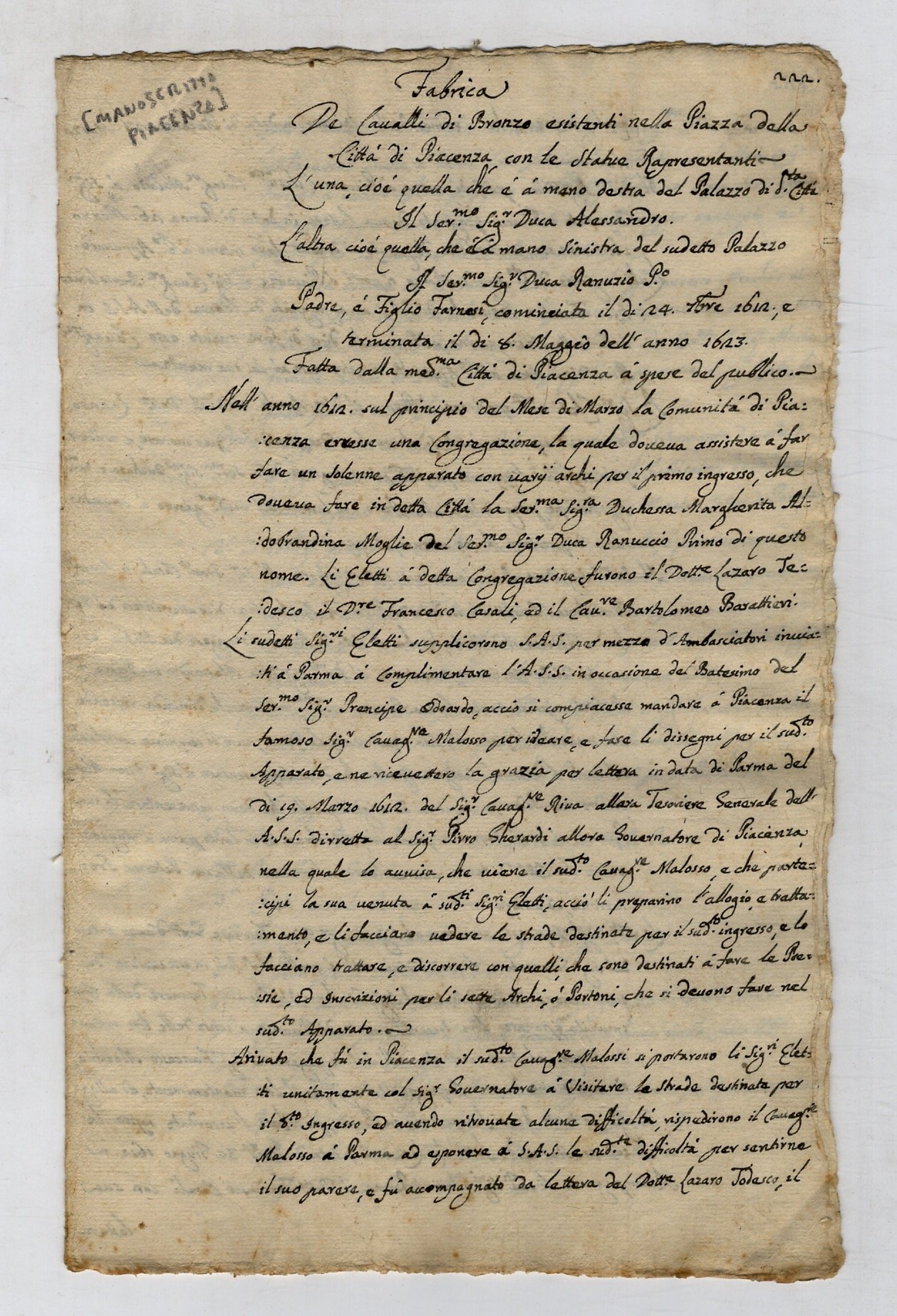 Fabrica de cavalli di bronzo esistenti nella Piazza della città di Piacenza con le Statue Rapresentanti [sic] l'una, cioè quella che è a mano destra dal Palazzo di d.ta Città il Ser.mo Sig.n Duca Alessandro, l'altra cioè quella che è a mano sinistra dal sudetto Palazzo Il Ser.mo Sig. Duca Ranuzio, padre e figlio Farnese, cominciata il dì 24 dicembre 1612 e terminata il dì 8 maggio dell'anno 1623 [.].
