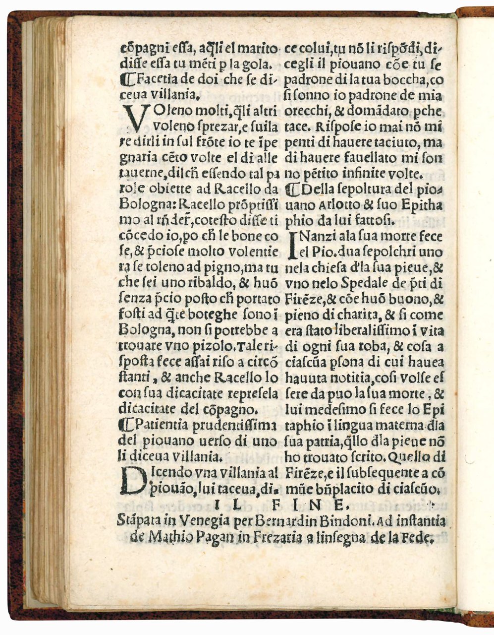 Facetie: Piacevoleze: Fabule: e Motti. Del Piovano Arlotto Prete Fiorentino, homo di grande inzegno. Opera molto dilectevole vulgare in lingua Toscha hystoriata, & novamente impressa. Colophon: Sta[m]pata in Vinegia per Bernardin Bindoni. Ad istantia de Mathio Pagan in Frezaria a l'insegna de la Fede