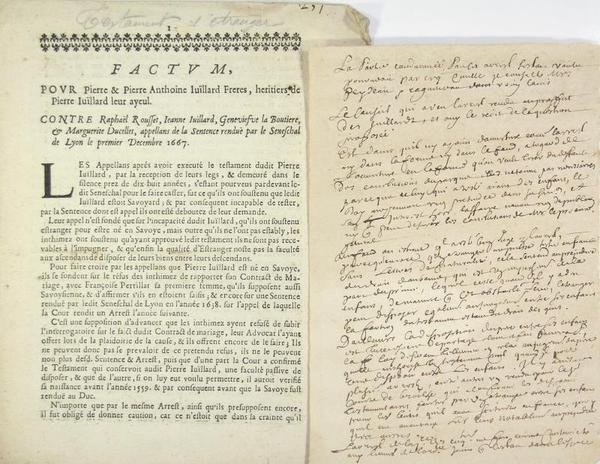 Lyon, 1667. 25 x 19 cm - Notes manuscrites du temps en marge du dernier feuillet ; une feuille manuscrite idem jointe.Parle de la Savoie.