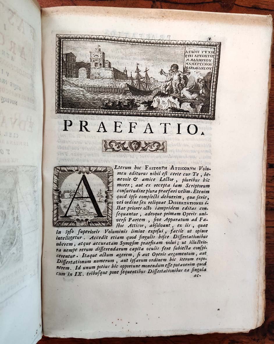 Quattro tomi in due volumi in 4to (mm. 270x190). Vol. I (1744): pp. XXVII, [1 bianca], 387, [1 bianca] ed 1 (di 2) tabelle ripiegate fuori testo; vol. II (1744): pp. VIII, 472; vol. III (1751): [4], pp. LXIV, 305 [i.e. 295], [1 bianca]; vol. IV (1756): VIII, 26, [2], LXIV, 203, [1 bianca] (manca il fascicolo D, ossia le pp. 25-32). Pergamena rigida coeva, titolo in oro su tassello rosso al dorso (etichetta con il numero 13 vergato a mano al dorso del primo volume). Bellissima copia intonsa con barbe e a fogli chiusi. Nel primo volume una parte generale (prime XIV pagine), contenente il frontespizio generale dell'opera e la dedica, precede il frontespizio del primo tomo. Occhietto in ogni volume (Fasti Attici in partes duas et quatuor volumina distributi). Frontespizi stampati in rosso e nero con vignette calcografiche al centro. Belle iniziali, testate e finalini calcografici e xilografici.