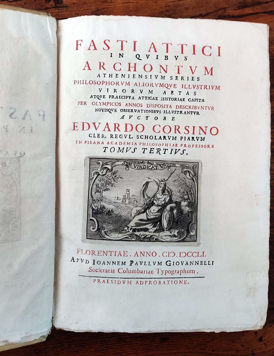 Fasti Attici in quibus archontum Atheniensium series philosophorum, aliorumque illustrium virorum aetas atque praecipua Atticae historiae capita per Olympicos annos disposita describuntur novisque observationibus illustrantur auctore Eduardo Corsino