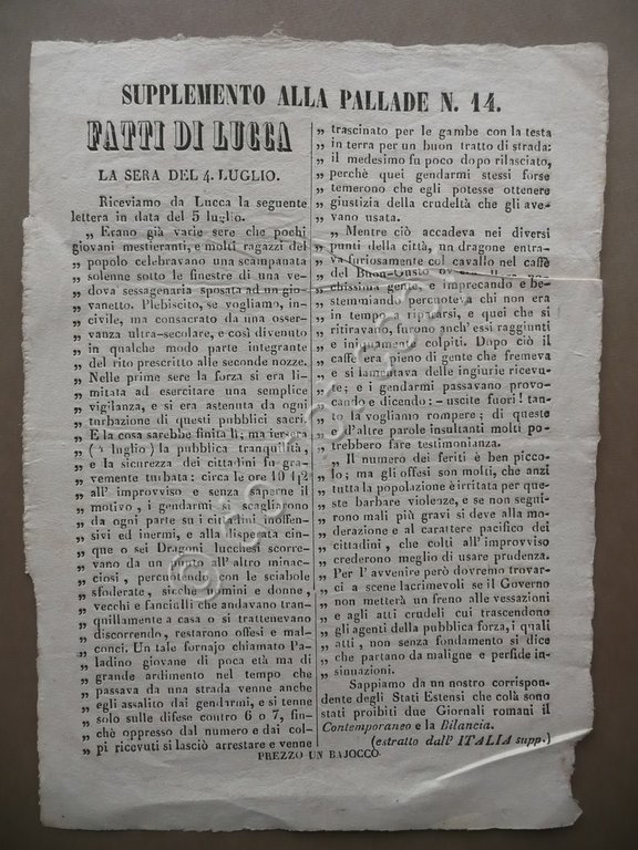 Fatti di Lucca Supplemento alla Pallade N.14 Violenze Dragoni Lucchesi 4 Luglio