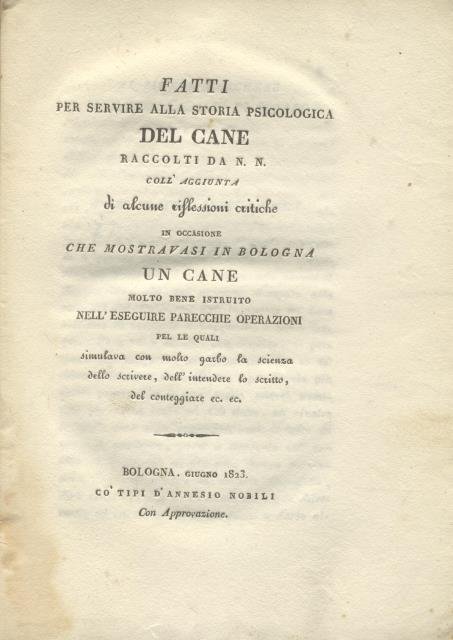 FATTI PER SERVIRE ALLA STORIA PSICOLOGICA DEL CANE. Raccolti da N.N. coll'aggiunta di alcune riflessioni critiche in occasione che mostravasi a Bologna un cane molto bene istruito nell'eseguire parecchie operazioni pel le quali simulava con molto garbo la scienza dello scrivere, dell'intendere lo scritto, del conteggiare, etc.