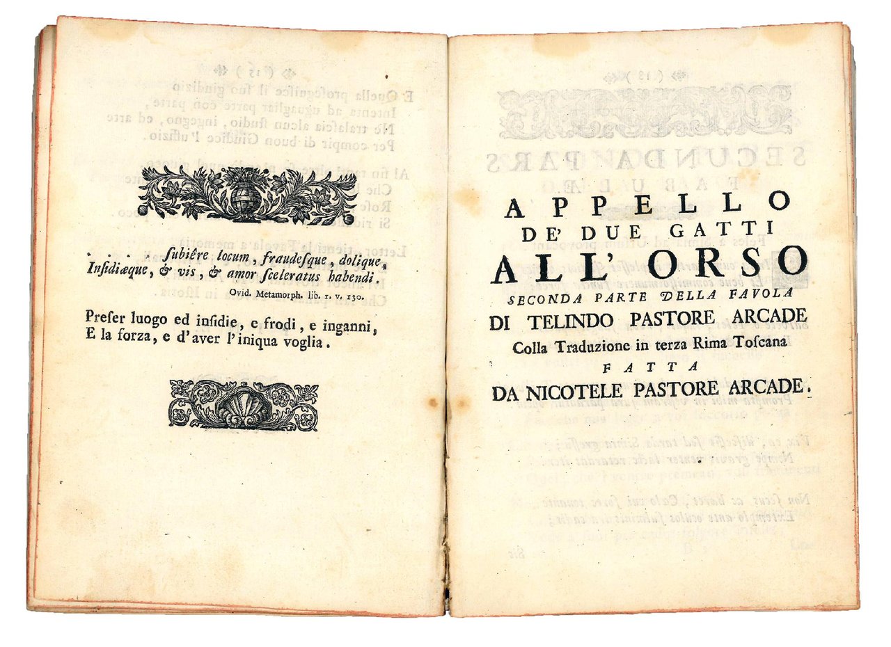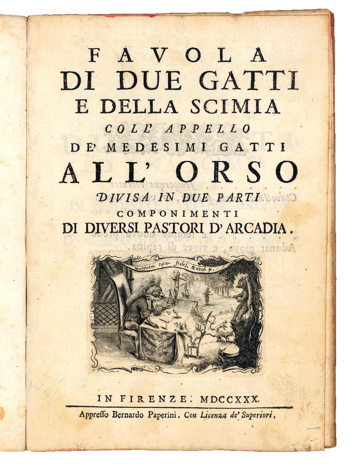 Rara prima edizione completa di questa favola arcade in versi con testo parallelo latino e italiano, che comprende due parti: la prima, Due gatti ed una scimia, opera di ‘Nadisto' (Francesco Lelli) e ‘Ergisto Balirio' (Francesco Buttari), era già stata stampata nel 1728; la seconda, Appello de' due gatti all'orso (p. 17), di ‘Telindo' e ‘Nicotele', appare invece qui per la prima volta. Entrambe sono pubblicate sotto gli pseudonimi pastorali solitamente assunti dagli Arcadi ed esprimono gli ideali pastorali tipici dell'Accademia.