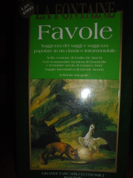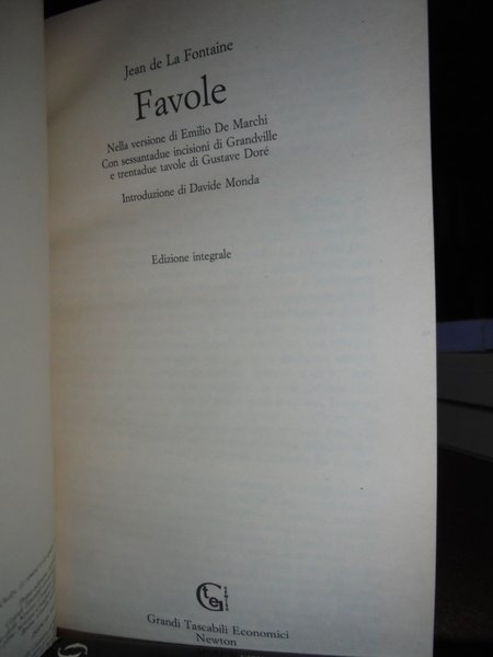La Fontaine. Roma, Newton, 1994. FAVOLE. Saggezza dei saggi e saggezza popolare in un classico intramontabile. Nella versione di Emilio De Marchi. Introduzione di Davide Monda. Edizione integrale. In-8°, cart. edit. 365 pp. con sessantadue incisioni di Grandville e trentadue tavole di Gustave Doré. In ottimo stato di conservazione. Neg. lett. mod. mob. C.