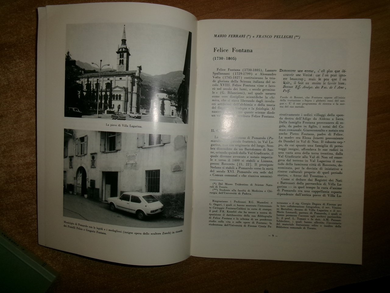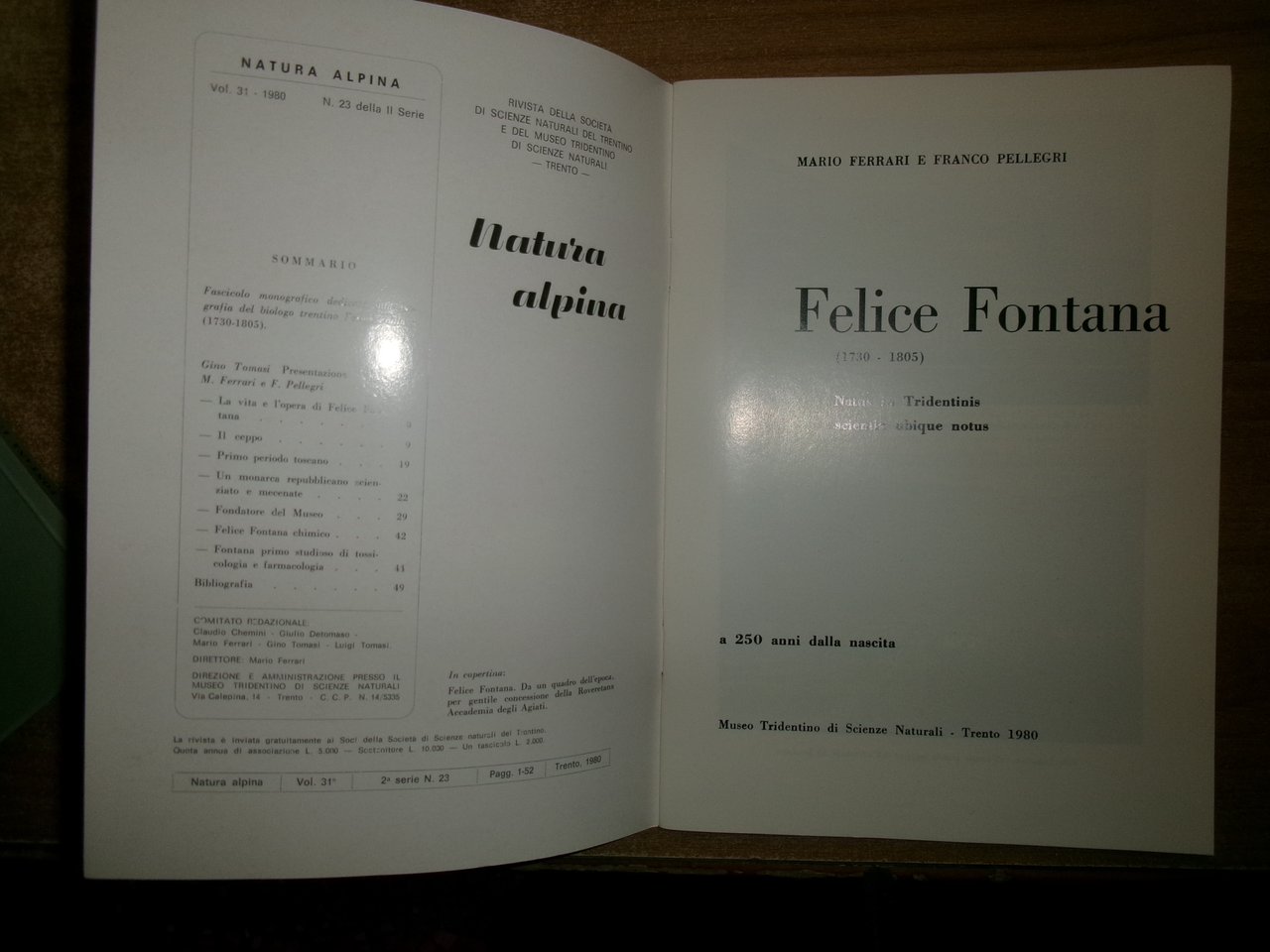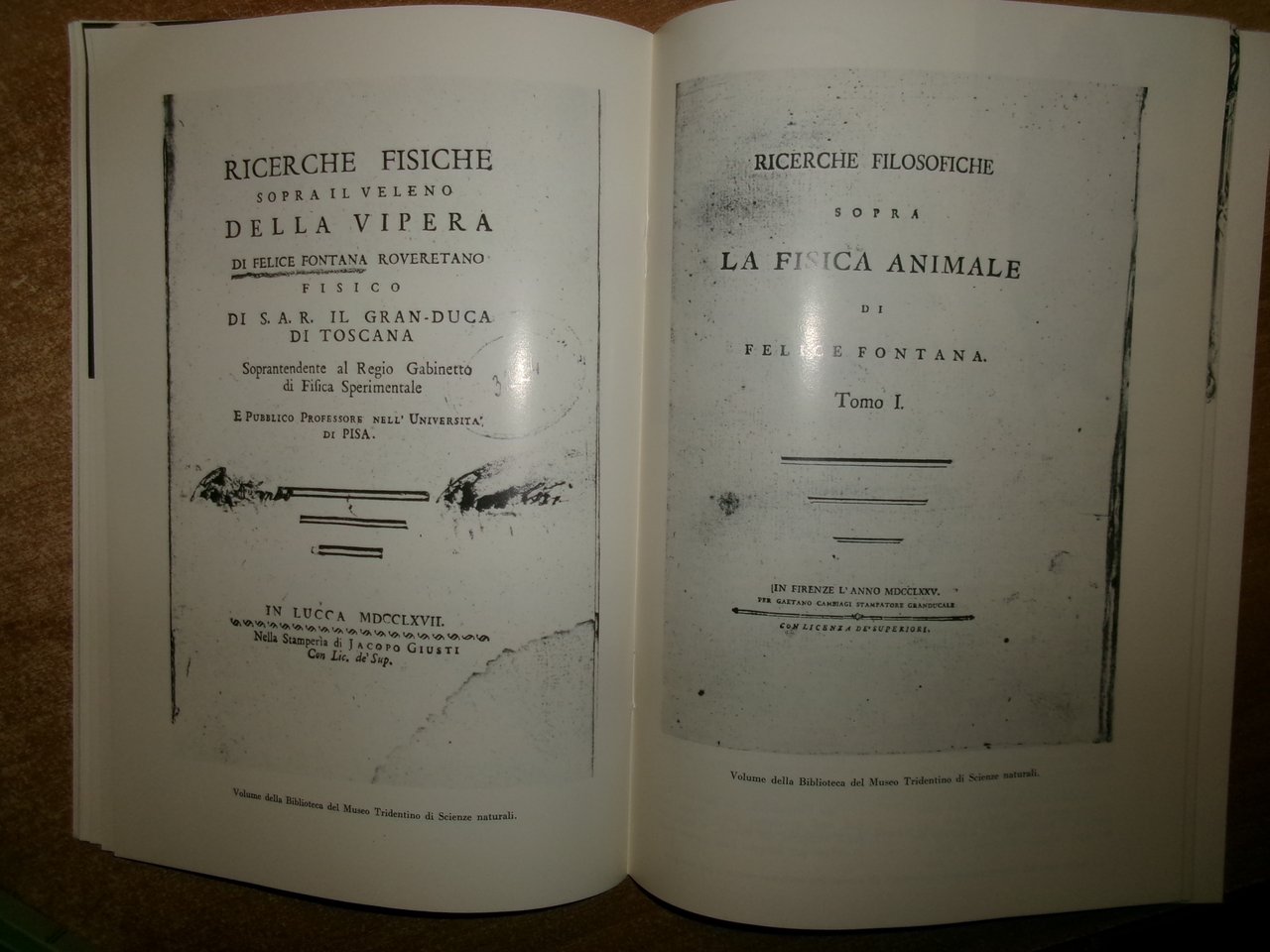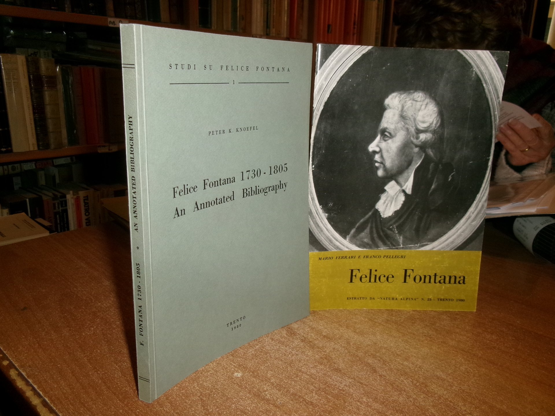 Peter K. KNOEFEL. MARIO FERRARI e FRANCO PELLEGRI. Trento, 1980. FELICE FONTANA 1730-1805 An Annotated Bibliography. Felice Fontana Estratto da " Natura Alpina" 2 volumi in-8°, br. 1 volume 1 opuscolo in-8°, br. (iv), 133 pp. con alcune tavole f.t.; 51 pp. con illustrazioni in nero n.t. Ottimo stato. Neg. lett. mod. mob. C entro busta trasp.