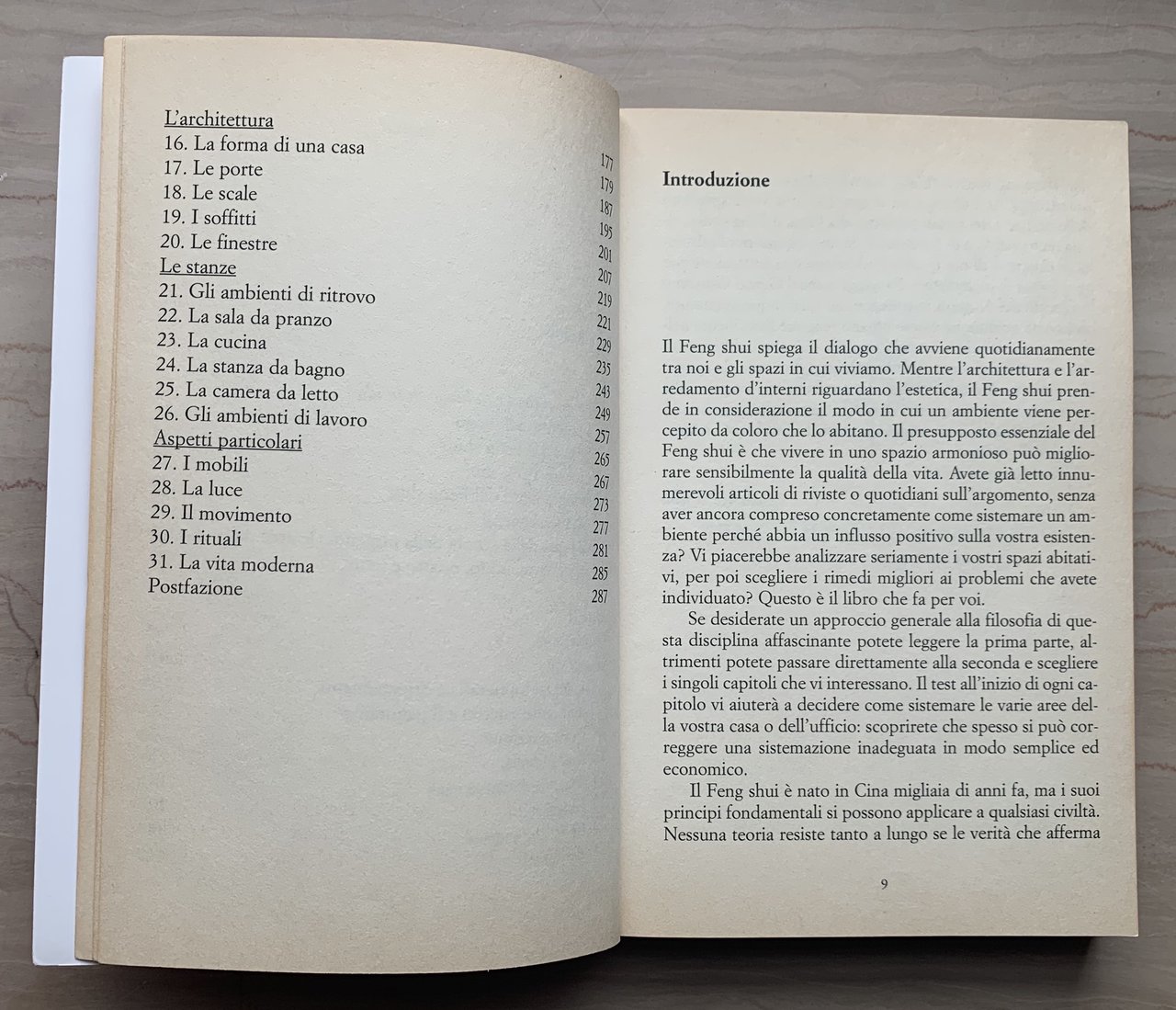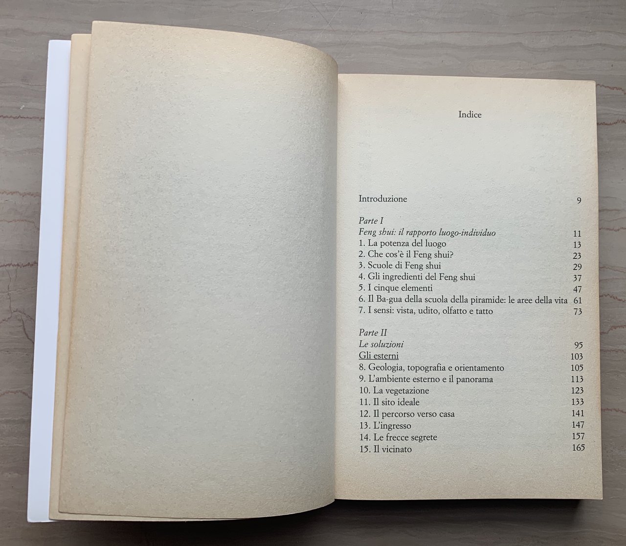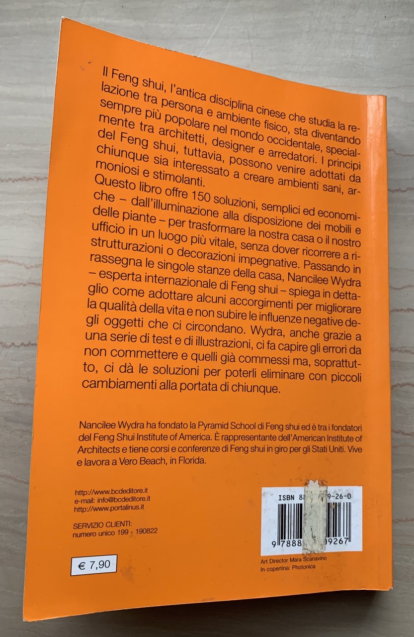 II ed. italiana: settembre 2003 (© Feng Shui. The Book of Cures, Illinois, Usa 1996. Material from The Power of Place by Winifred Gallagher, © 1993 by Winifred Gallagher, reprinted with the permission of Simon&Shuster. Interior design by Mary Lockwood - I ed. italiana: Milano, Zelig editore s.r.l. 1999). Traduzione dall'americano di Silvia Crema. Collana super nani 33. VIII/290 compresa la copertina/brossura patinata (In copertina: Photonica. Art Director: Mara Scanavino. Disegni e schemi in nero nel testo. Stato buono (nastro adesivo bianco incollato parzialmente sul codice a barre in quarta di copertina - pagine brunite - firma di possesso a penna nera in copertina).