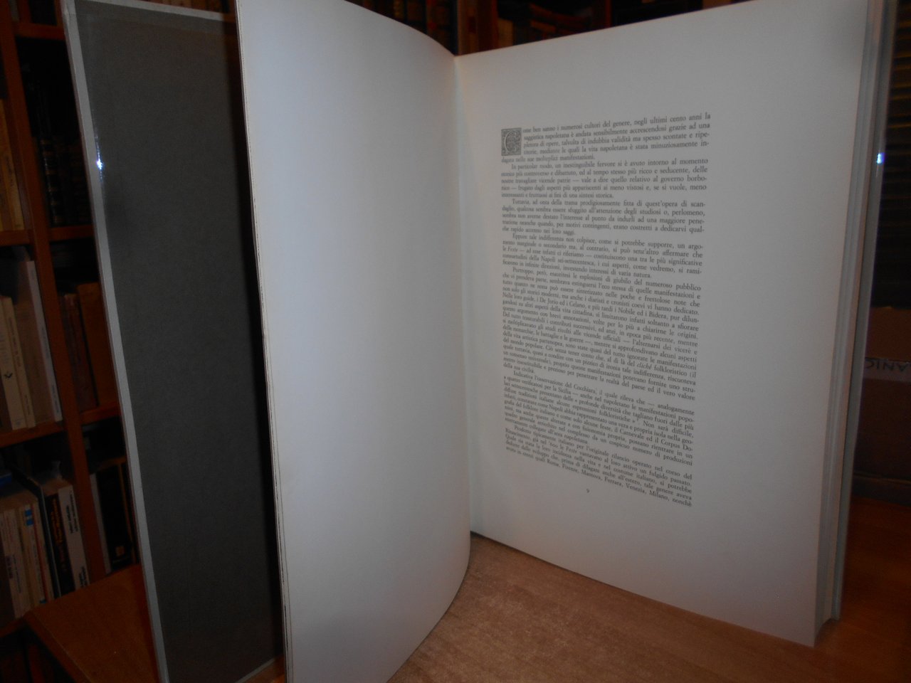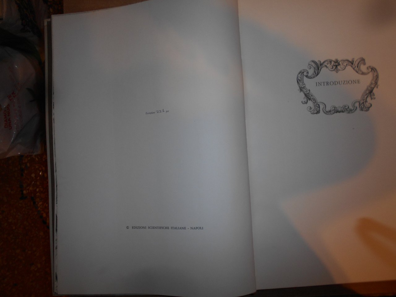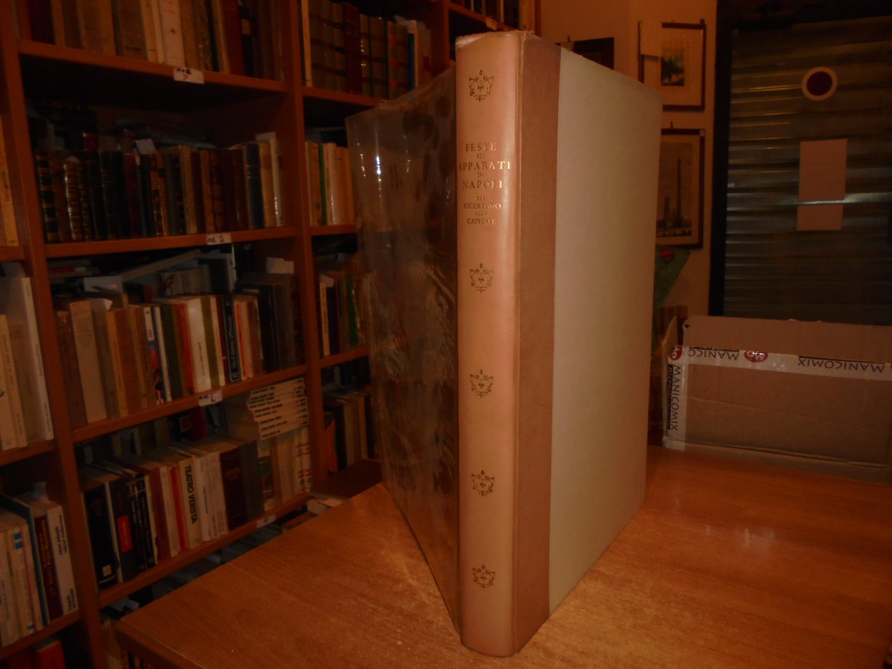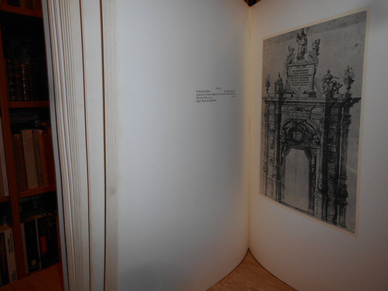 FRANCO MANCINI. In Napoli, per le Edizioni Scientifiche Italiane, MCMLXVIII. In-folio (51 x 37 cm.), m. pelle con fregi e titolo in oro al dorso, sovracopertina in acetato. 312, (4) con ill. a col. applicate su tavv. f.t., 6 tavole b/n f.t. ripieg. con riprod. di antiche stampe, 152 figg. n.t. ed in fine 32 tavv. n.t. con riprod. di disegni. Indice dei nomi e dei luoghi, bibliografia. Ediz. di 1000 esemplari num. (ns. 221). Peso circa 8 KG. Ottimo esemplare. Uff. stanza antic. a destra in basso