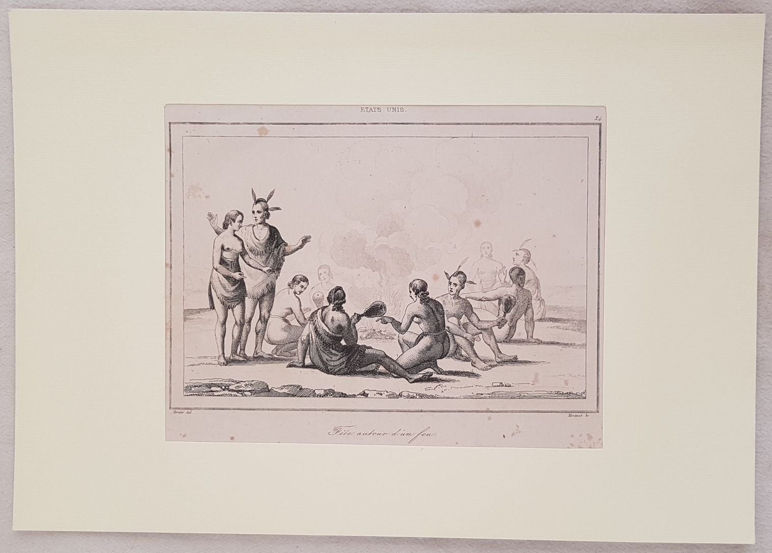 Veduta animata del 1838 circa che mostrano nativi indiani intorno a un fuoco montati in passepartout. Data: 1838 circa Tecnica: acquaforte Dimensione foglio: 17,5x25 cm Dimensione incisione: 11,5x15 cm Condizioni: Buone. Rare fioriture.Nice view of Native Indians making a party around the fire of 1838 circa mounted in a passepartout. Date: 1838 circa Technique: Steel etching Passepartout Dimension: 17,5x25 cm (6.9x9.8 inches) Engraving Dimension: 11,5x15 cm (4.5x5.9 inches) Conditions: Good conditions. Some foxings.<BR><BR>
