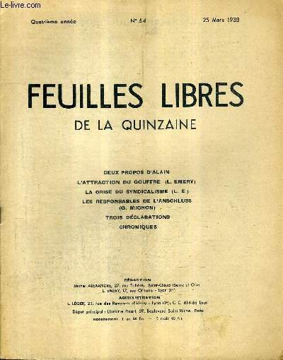 FEUILLES LIBRES DE LA QUINZAINE N�54 4E ANNEE 25 MARS 1938 - deux propos d'alain - l'attraction du gouffre (L.Emery) - la crise du syndicalisme (L.E.) - les responsables de l'anschluss (G.Michon) - trois d�claration - chroniques.