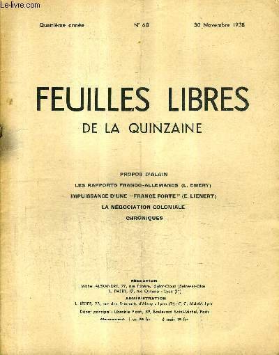 FEUILLES LIBRES DE LA QUINZAINE N�68 4E ANNEE 30 NOVEMBRE 1938 - propos d'alain - les rapports franco allemands (L.Emery) - impuissance d'une france forte (E.Lienert) - la n�gociation coloniale - chroniques.