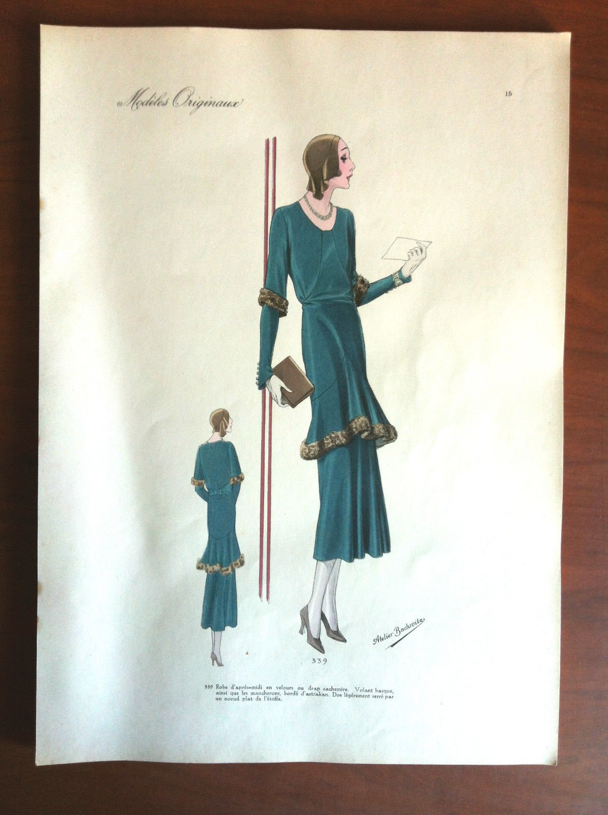 Atelier Bachroitzlitografia originale Tratta da Beaux-Arts des modesParis 1931coloritura manuale misure 27,5x38,5 cm. (20 g)Descrizione: Robe d'apres-midi en velours ou drap cachemire. E7525
