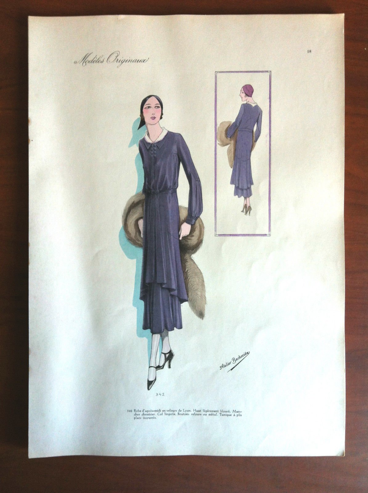 Atelier Bachroitzlitografia originale Tratta da Beaux-Arts des modesParis 1931coloritura manuale misure 27,5x38,5 cm. (20 g)Descrizione: Robe d'Apres-Midi en velours de Lyon. E7528