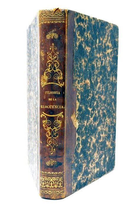 (1 feuillet blanc). 2 feuillets. XVI. 416 pages. 4 feuillets. (1 feuillet blanc). Demi maroquin havane, dos lisse orné (reliure de l'époque, quelques traces d'usure). Publié à Madrid en 1842 par l'éditeur Sancha, cet ouvrage d'Antonio de Capmany, figure éminente des Lumières espagnoles, se penche sur l'art oratoire sous un angle philosophique. Capmany, à travers son analyse, relie les racines antiques de la rhétorique aux besoins communicationnels de son temps, anticipant des débats qui restent pertinents dans les sociétés contemporaines sur le pouvoir des mots et leur impact dans l'espace public. Rousseurs éparses.