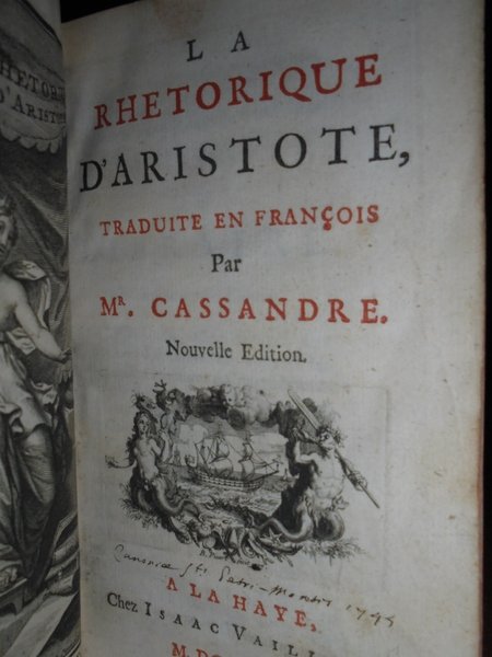 (Filosofia) ARISTOTELES. La Rhetorique d' Aristote, traduite en françois par Mr. Cassandre. Nouvelle édition. La Haye, Isaac Vaillant, 1718. In-12°, piena pelle coeva, dorso a nervo decorato in oro. (24), 490, (26) pp., 1 f. bianco, con antiporta allegorica incisa in rame. Quérard, La France littéraire, I, p. 90. Ben conservato. Neg. lett. antica mob. 6.