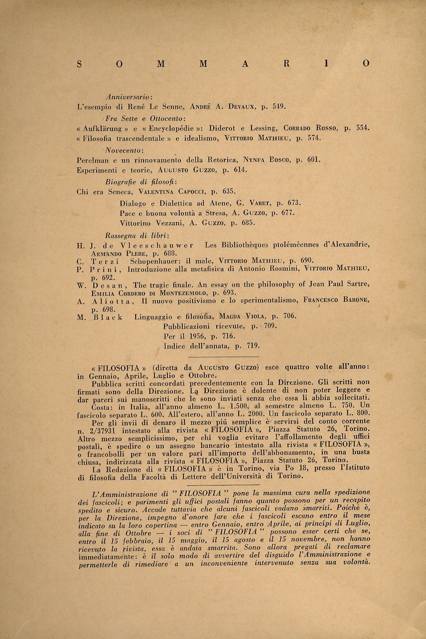 Torino, Edizioni di "Filosofia", 1955, un fascicolo, in-8, br. editoriale, pp. numerate da 549 a 720. Dall'indice: André A. Devaux "L'esempio René Le Senne", Corrado Rosso "Aufklarung e Encyclopédie: Diderot e Lessing", Vittorio Mathieu "Filosofia trascendentale e idealismo", Augusto Guzzo "Esperimenti e teorie", Valentina Capocci "Chi era Seneca", G. Varet "Dialogo e dialettica ad Atene", ecc.