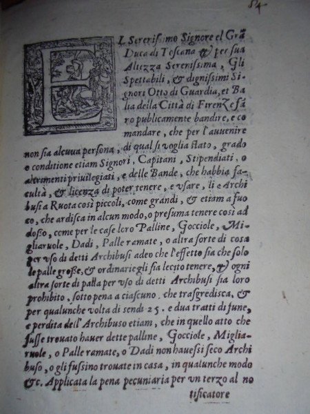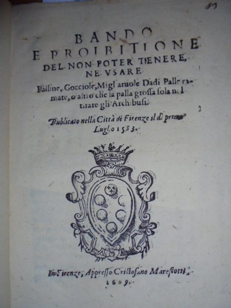 (Firenze) Bandi. BANDO e PROIBITIONE del non poter tenere, ne usare palline, gocciole, migliaruole, dadi, palle ramate o altro che la palla grossa sola nel tirare gli archibusi