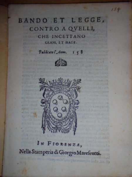 Bandi. BANDO et LEGGE contro a quelli che incettano grani, et biade. Publicata l' anno 158(0). In Fiorenza, nella Stamperia di Giorgio Marescotti. In-4° antico, cop. in varese. (8) pp. Arme ducale nel front. Pac. 2. uff.