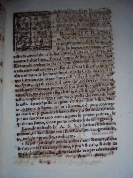 Bandi. PROVISIONE per li Rettori che vanno in offitio che non ricevino dalli Notai mercede alcune de Banchi non tassati, e per quelli tassati non ricevino maggiore somma di quella che eran soliti pagare, nel quale sono descritti i Banchi non tassati e quelli che pagano la tassa, e quanta. Publicata. il dì 11 di Settembre 1615. In Firenze, appresso gl' Heredi di Cristofano Mariscotti. In-4° antico, cop. in varese. (6) pp., 1 f. bianco. Arme ducale nel front. Opuscolo con arrossature. Pac. 3 Uff. Mob. 3