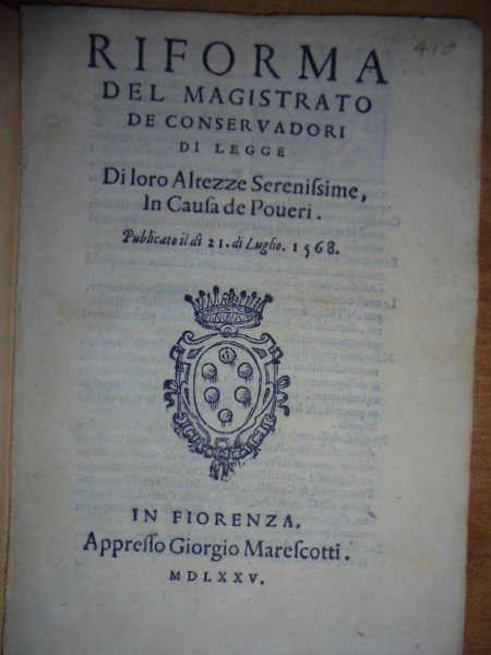 Bandi. RIFORMA del Magistrato de Conservadori di Legge di loro Altezze Serenissime, in causa de poveri. Publicato il dì 21 di Luglio 1568. In Fiorenza, appresso Giorgio Marescotti, 1575. In-4° antico, cop. in varese scura. (4) pp. Arme ducale nel front. Opuscolo. Pac 3. Uff. Mob 3.