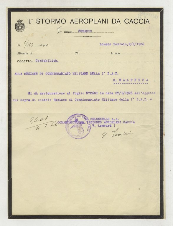 Firma autografa su una lettera dattiloscritta (oggetto: contabilità) sulla facciata d'un foglio di carta intestata "I° Stormo Aeroplani da Caccia". Datata: "Lonate Pozzolo, 2/2/1926".
