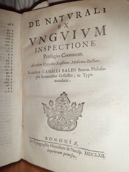 (Fisiognomica - Esoterismo - Grafologia) BALDI, Camillo. Bononiae, typis HH. Evangelistae de Ducciis, 1664. De humanarum propensionum ex temperamento praenotionibus, De naturalibus ex unguim inspectione presagiis, et De ratione cognoscendi mores et qualitates scribentis ex ipsius Epistola missiva, nunc prinium in latinum sermonem prodiens tractatus tres. In-4°, antico cartone coevo officinale. (4), 251, (1) pp. I tre trattati, riuniti in questa edizione hanno ciascuno un frontespizio proprio. Ottimo esemplare di questo curioso studio psicologico riguardante l' ispezione delle unghie, e della scrittura. Camillo Baldi, noto anche come Camillus Baldus o Camillo Baldo (Bologna, 1547 – 1634), è stato un letterato italiano, nonché professore di logica e filosofia. È considerato il precursore della grafologia.