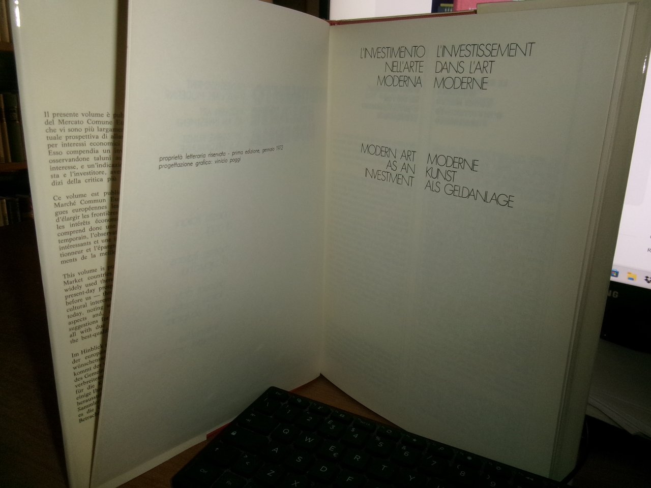 Flaminio Gastone Pezzuoli - L' INVESTIMENTO NELL' ARTE MODERNA - 1972. Bologna, Il Resto del Carlino, 1972. In-8° grande, tela rossa edit. con sovracop. ill. a col. 155 pp. con numerose illustrazioni a colori e in nero n.t. lingua : italiano - francese - inglese - tedesco. Ottimo stato. Neg. mob. F