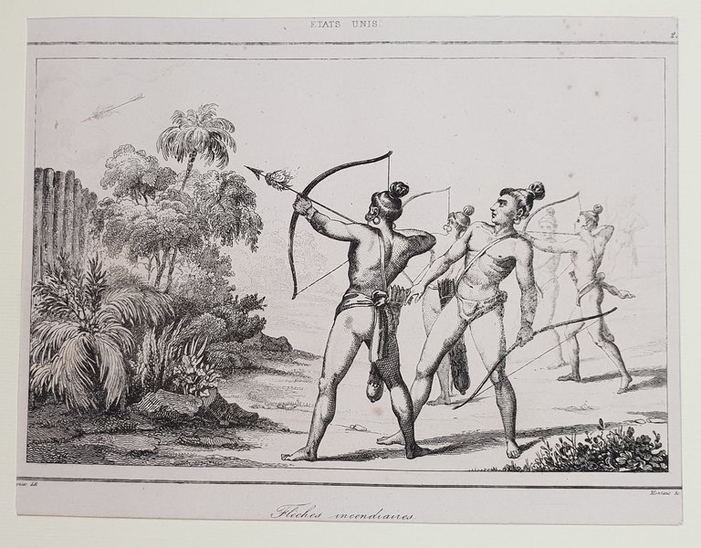 Veduta animata del 1838 circa che mostra indiani nativi che scoccano frecce incendiarie montati in passepartout. Autore: Montaut su soggetto di Vernier Data: 1838 circa Tecnica: acquaforte Dimensione foglio: 17,5x25 cm Dimensione incisione: 11,5x15 cm Condizioni: Buone. Rare fioriture.Nice view of fired arrow in a buttle of 1838 circa mounted in a passepartout. Author: Montaut after Vernier Date: 1838 circa Technique: Steel etching Passepartout Dimension: 17,5x25 cm (6.9x9.8 inches) Engraving Dimension: 11,5x15 cm (4.7x5.9 inches) Conditions: Good conditions. Some foxings and water stains. <BR><BR>