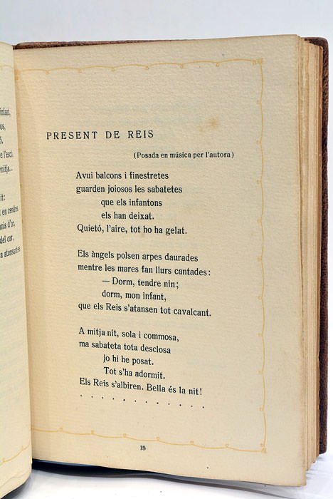 132 pages. 1 feuillet. (16,5x13 Cm). Plein maroquin. Dos lisse orné et titré en lettres dorées. Plats ornés aux angles et au centre de motfs dorés et à froid, tête dorée. recueil publié à l'âge de 23 ans par la poétesse catalane Merçè María Tobella de Minguez Faraudo. D'inspiration romantique, cet ouvrage de jeunesse dédié à ses parents est une ode à la nature, à l'amour, et à la musique. Très bel exemplaire dans une charmante reliure en maroquin, au décor d'inspiration moderniste. Exemplaire en bon état à part quelques rares taches et rousseurs.