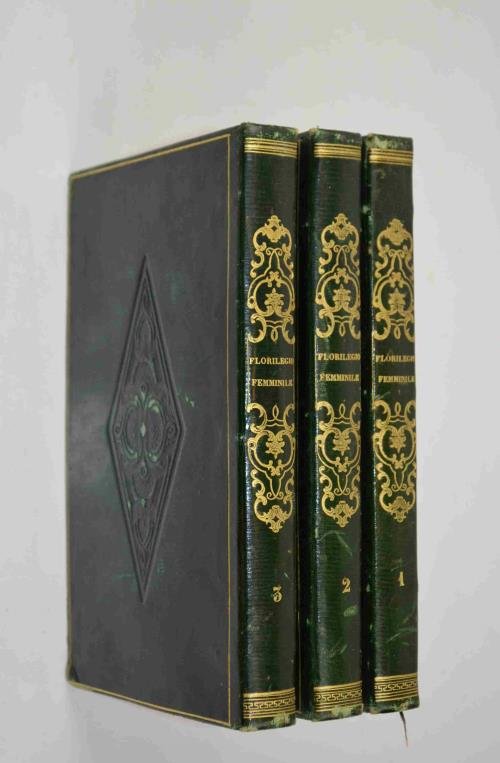 Tre volumi di cm. 21,5, pp. 1000 ca. complessive. Con 9 bei ritratti incisi in rame su altrettante tavole f.t. (ciascuno protetto da velina). Solida ed elegante legatura coeva in pieno marocchino verde, dorsi lisci con titoli e fregi romantici in oro. Piatti inquadrati da filetto in oro e fregi centrali a secco. Bell'esemplare, fresco e marginoso. Bella e rara raccolta antologica di scrittrici femminili.