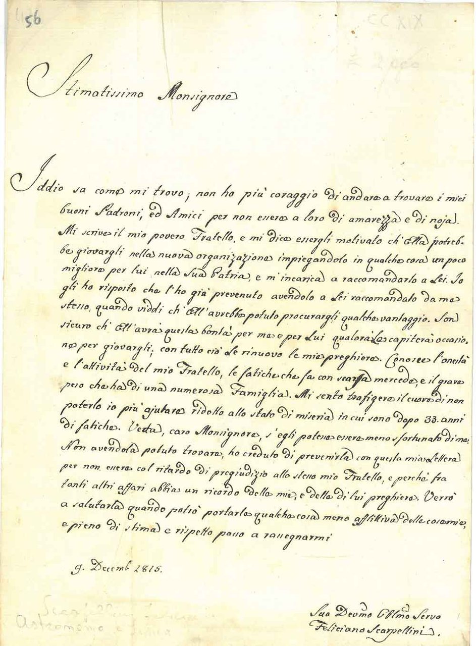 19x27, 18 righe autografe e in cui il celebre astronomo chiede aiuto al monsignore per il fratello: " . Conosce l'onestà e l'attività di mio fratello, le fatiche che fa con santa mercede, e il grave peso che ha di una numerosa famiglia. Mi sento trafiggere il cuore di non poterlo più ajutare ridotto allo stato di miseria in cui sono dopo 33 anni di fatiche."