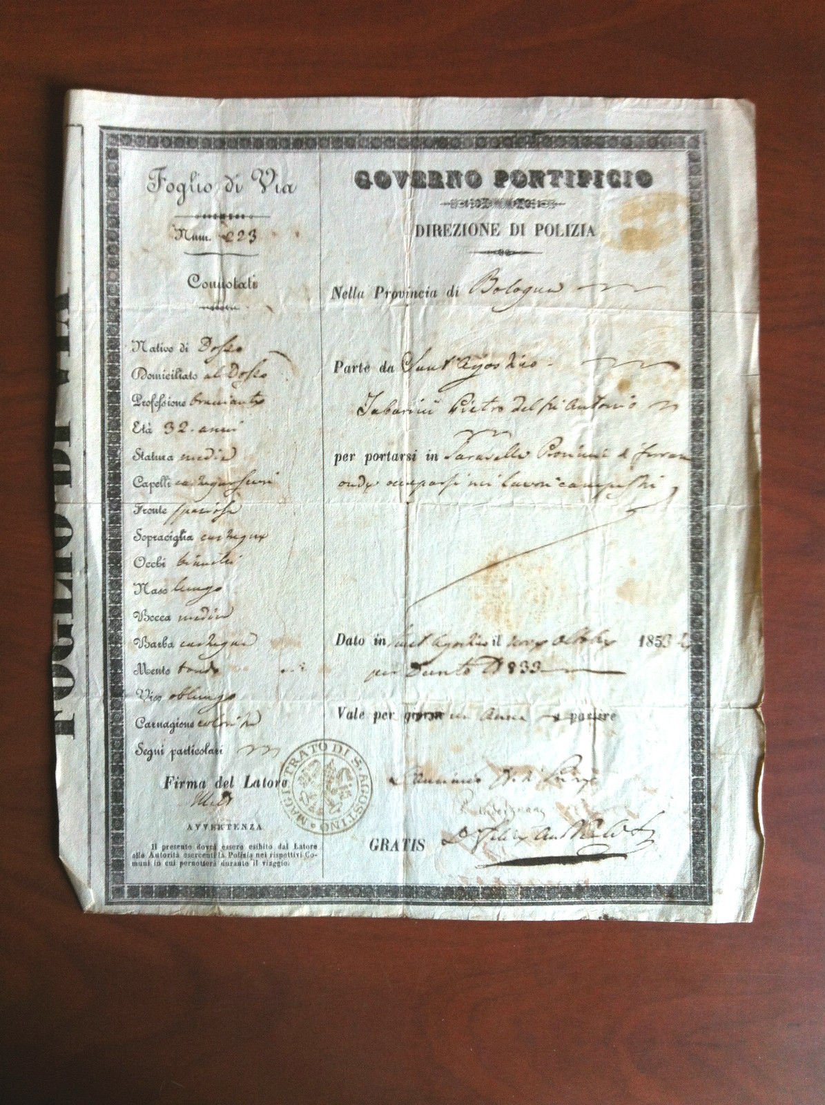 Foglio di Via Governo Pontificio Polizia di Copparo Sant'Agostino 1853 - E10637