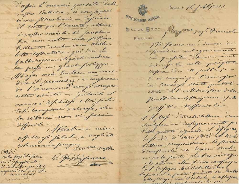 Foglio piegato a metà con intestazione: "Reale Accademia Albertina di Belle Arti. Direzione", datata: Torino, 16 febbraio