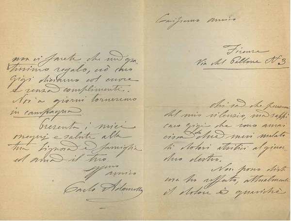 Foglio piegato a metà, senza data, ma: "Firenze, via del Pallone n. 3"