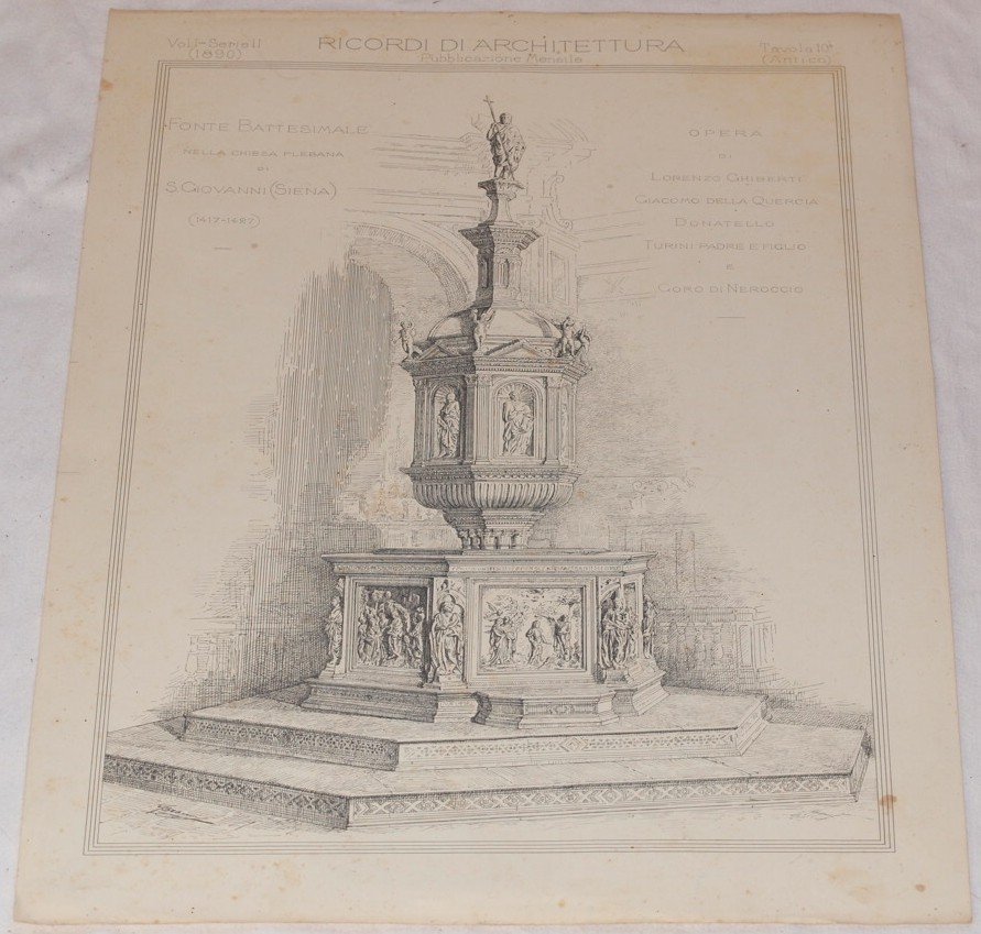 Bella litografia di architettura del 1890 tratta dal periodico mensile "Ricordi di architettura" pubblicato tra il 1878 e il 1900 diretto da Giacomo Roster, C. Corinti e E. Bartoli.<BR>La rivista documentava le numerose progettazioni, talvolta anche di riduzione e di ampliamento che fecero molti architetti dell'epoca. Di grandi dimensioni. TECNICA: Litografia DIMENSIONI FOGLIO: cm 54x38 DIMENSIONI INCISIONE: cm 47x32 EPOCA: 1890 CONDIZIONI: Buone condizioni, qualche fioritura. Beautiful lythography of architecture of 1890 taken from the monthly magazine "Ricordi di architettura" published between 1878 and 1900 directed by Giacomo Roster, C. Corinti and E. Bartoli. The magazine documented different projects, sometimes alos of reductioning and expansion done by many architects of that time. Of big size. TECHNIQUE: Lytography PAGE SIZE: cm 54x38 PRINT'S SIZE: cm 47x32 PERIOD: 1890 CONDITION: good conditions. Some yellowings and little missing parts in the edges
