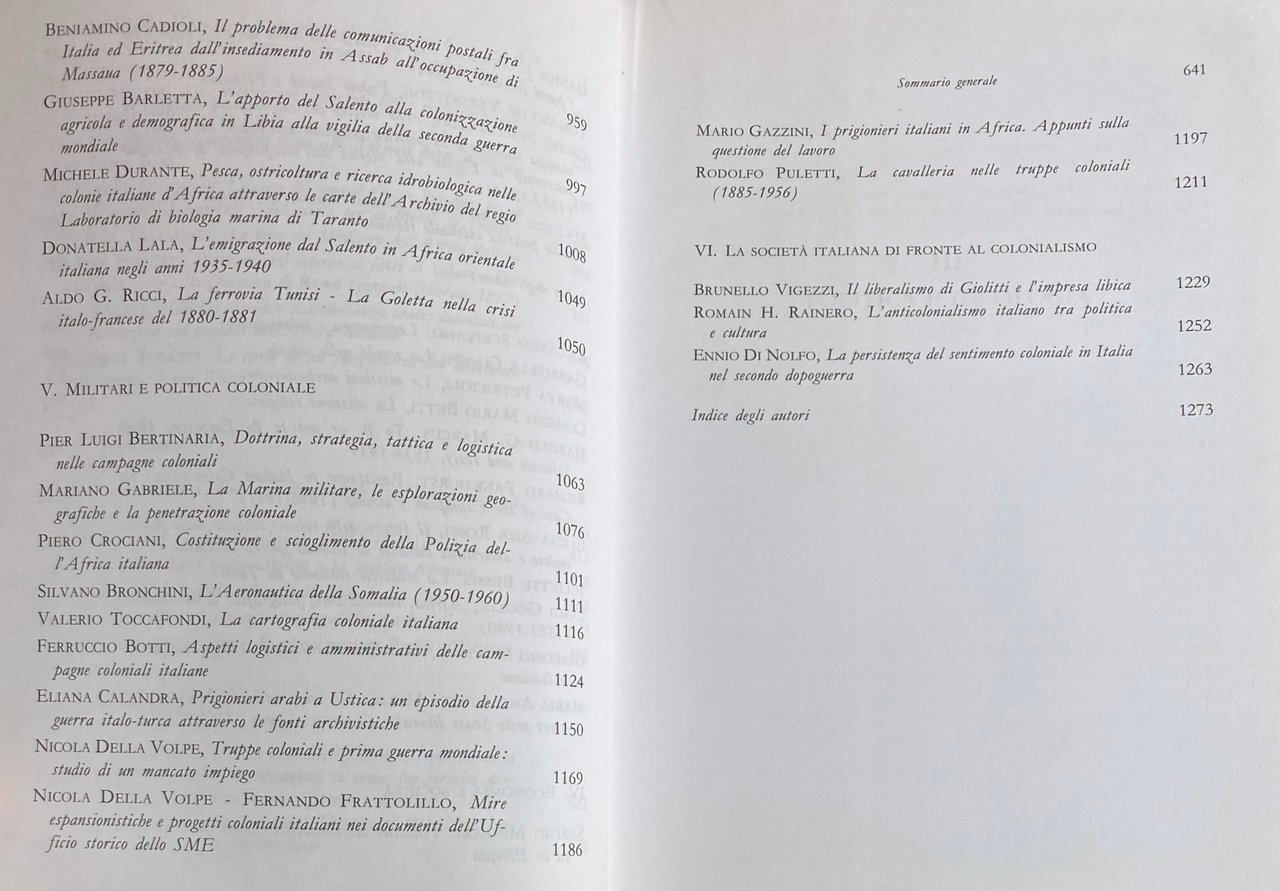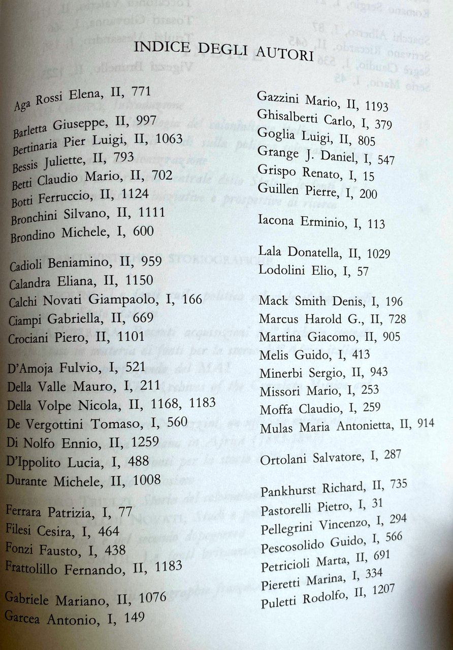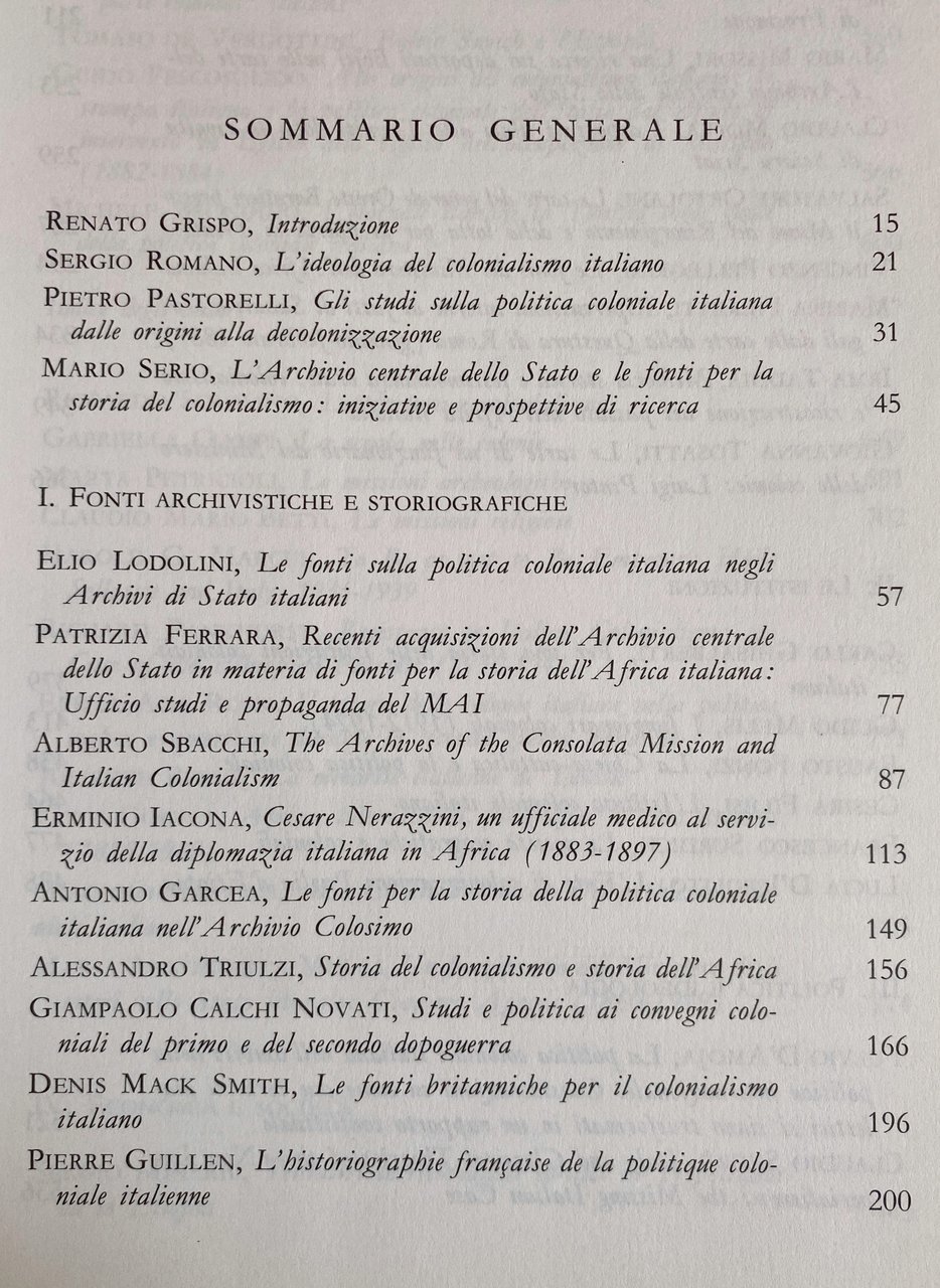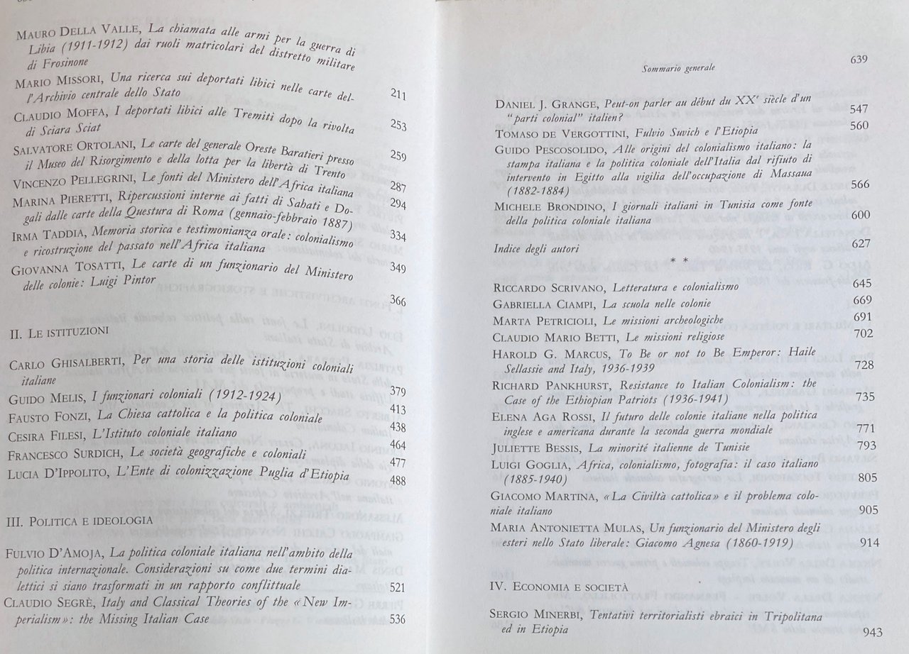 Autori Vari: Renato Grispo, Sergio Romano, Pietro Pastorelli, Mario Serio, Elio Lodolini, Patrizia Ferrara, Alberto Sbacchi, Erminio Iacona, Antonio Garcea, Alessandro Triulzi, Giampaolo Calchi Novati, Denis Mack Smith, Pierre Guillen, Mauro Della Valle, Mario Missori, Claudio Moffa, Salvatore Ortolani, Vincenzo Pellegrini, Marina Pieretti, Irma Taddia, Giovanna Tosatti, Carlo Ghisalberti, Guido Melis, Fausto Fonzi, Cesira Filesi, Francesco Surdich, Lucia D'Ippolito, Fulvio D'Amoja, Claudio Segre, Daniel. J. Grange, Tomaso De Vergottini, Guido Pescosolido, Michele Brondino, Riccardo Scrivano, Gabriella Ciampi, Marta Petricioll, Claudio Mario Betti, Harold G. Marcus, Richard Pankhurst, Elena Aga Rossi, Juliette Bessis, Luigi Goglia, Giacomo Martina, Maria Antonietta Mulas, Sergio Minerbi, Beniamino Cadioli, Giuseppe Barletta, Michele Durante, Donatella Lala, Aldo G. Ricci, Pier Luigi Bertinaria, Mariano Gabriele, Piero Crociani, Silvano Bronchini, Valerio Toccafondi, Ferruccio Botti, Eliana Calandra, Nicola Della Volpe, Nicola Della Volpe Fernando Frattolillo, Mario Gazzini, Rodolfo Puletti, Brunello Vigezzi, Romain H. Rainero, Ennio Di Nolfo