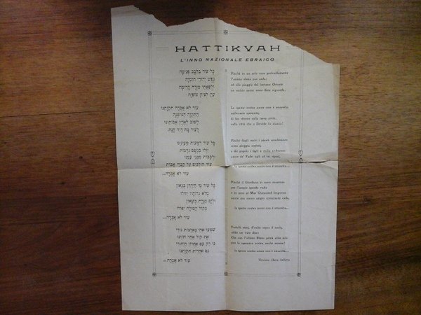 Molto buono, cart. ed. con titoli al piatto e al dorso, mancanza alla parte inf. del dorso, in - 8, 421 pp. Nuova ed. riordinata e corretta. Allegato: "Hattikvah, l'Inno nazionale ebraico", foglio dell'epoca rinvenuto all'interno del volume, in ebraico e in versione libera italiana. Mancanze e strappetti testo integro (vedi foto).